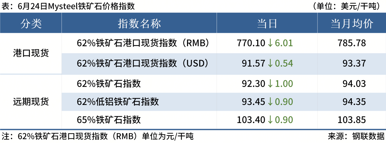 ◎ 6月24日,全國主港鐵礦石成交81.30萬噸,環(huán)比減31.2%;237家主流貿(mào)易商建筑鋼材成交9.32萬噸,環(huán)比減9.5%。