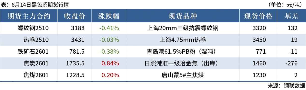 ◎8月14日,全國主港鐵礦石成交130.20萬噸,環(huán)比增54.6%;237家主流貿(mào)易商建筑鋼材成交8.38萬噸,環(huán)比減8.2%。
